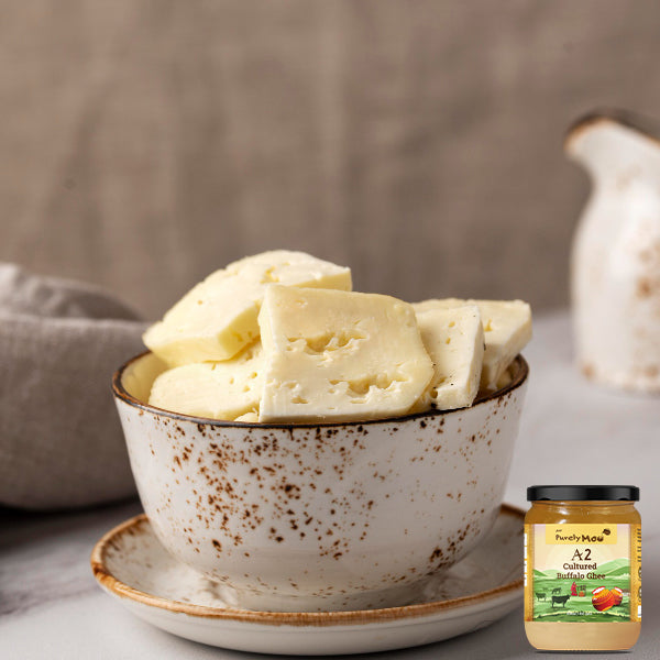 Cultured A2 Buffalo Ghee is prepared using butter derived from fermented curd, enhancing its probiotic properties and making it gentler on the digestive system.